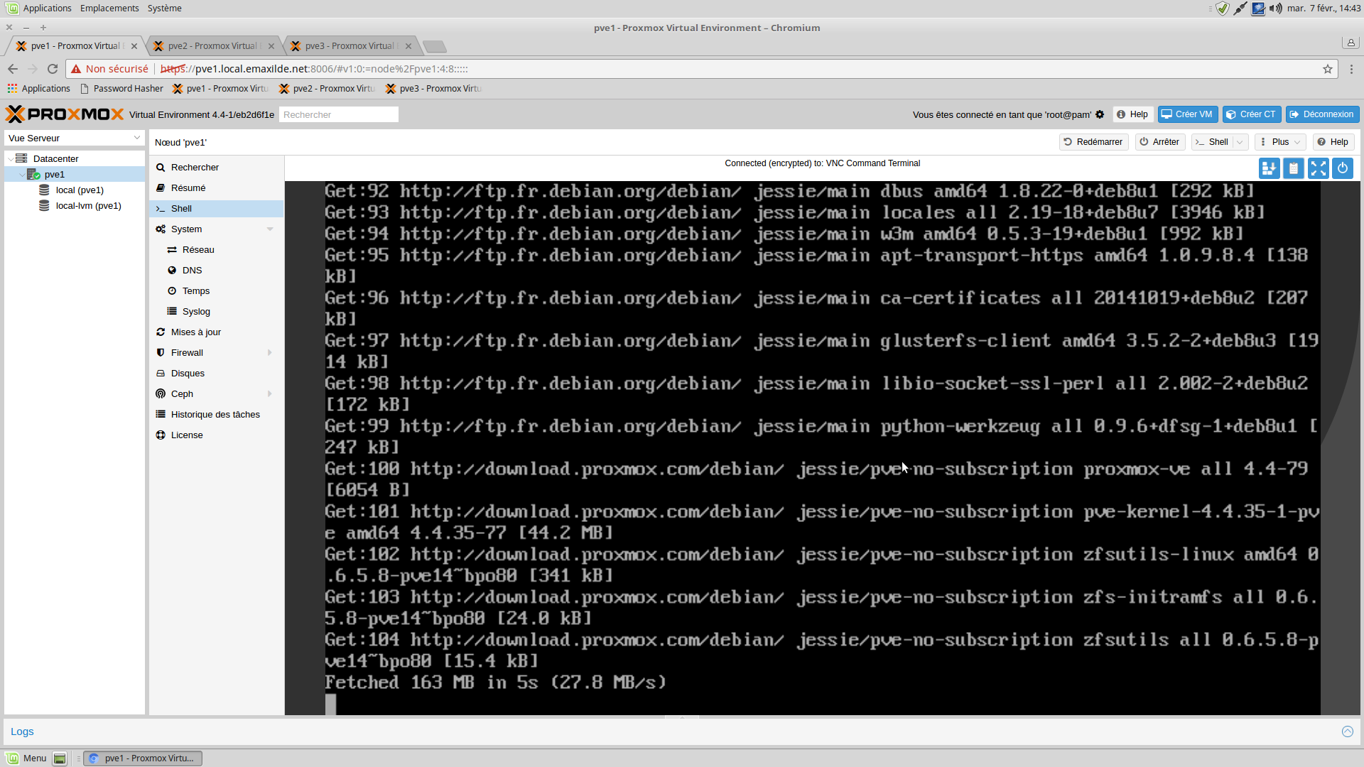 Allez sur chacun des nœuds, ouvrez un Shell, puis demandez au nœud local de rejoindre le cluster précédemment créé à l’aide de la commande pvecm add {adresse-ip-du-premier-noeud}.